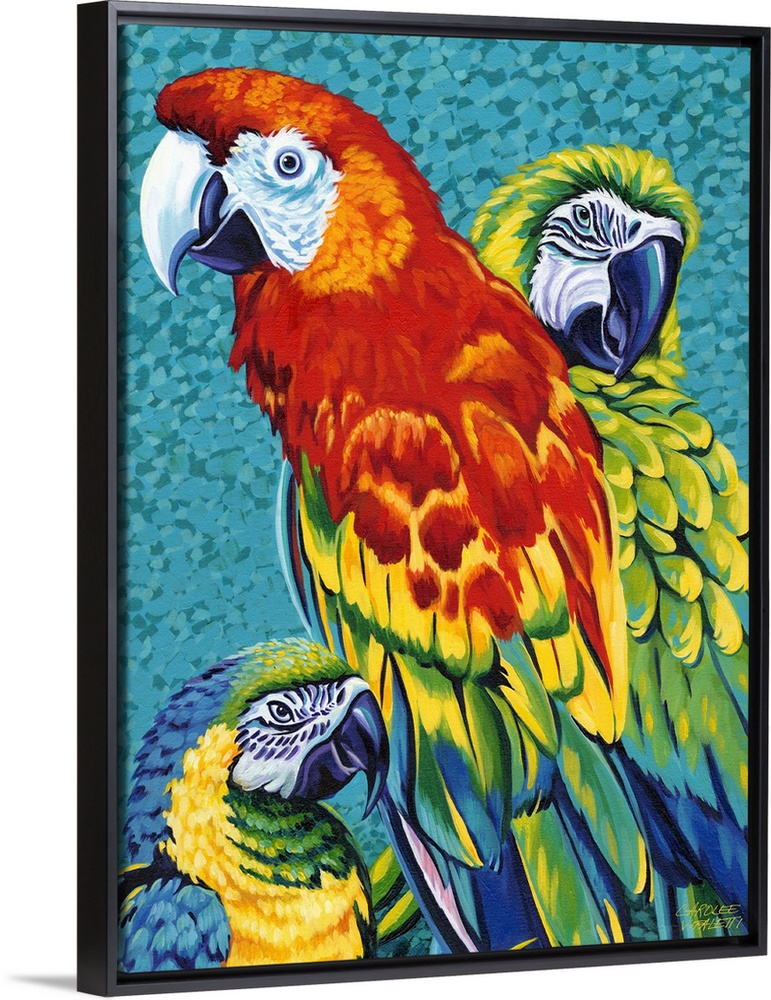 <p>Painting of three colorful macaw parrots, including a Scarlet, Blue and Gold, and Catalina Macaw.</p>