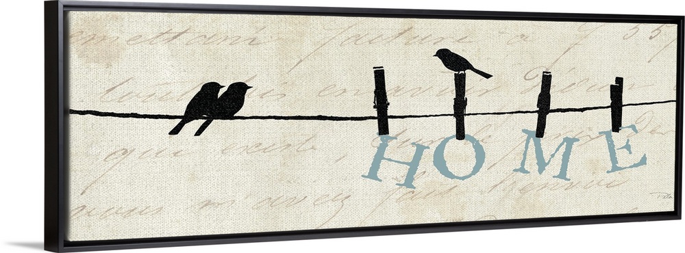 <p>Contemporary artwork of silhouetted birds on a wire with the word "Home" hanging from the line.</p>