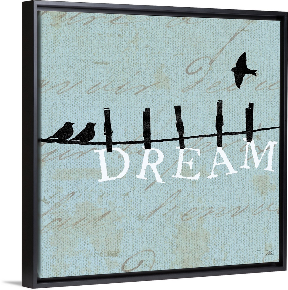 <p>Contemporary artwork of birds silhouetted on a cloths line, with the word "DREAM" hanging from the line underneath them.</p>