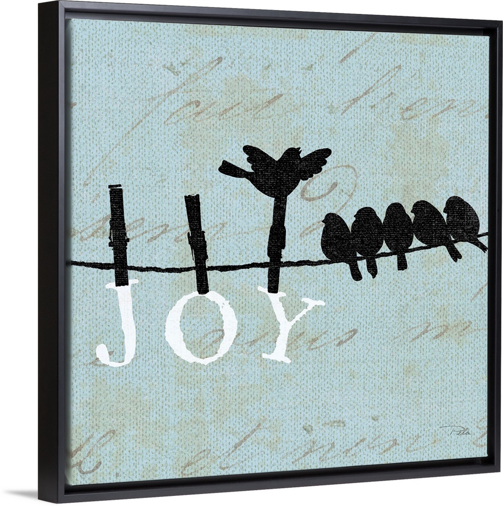 <p>Contemporary artwork of birds silhouetted on a cloths line, with the word "JOY" hanging from the line underneath them.</p>