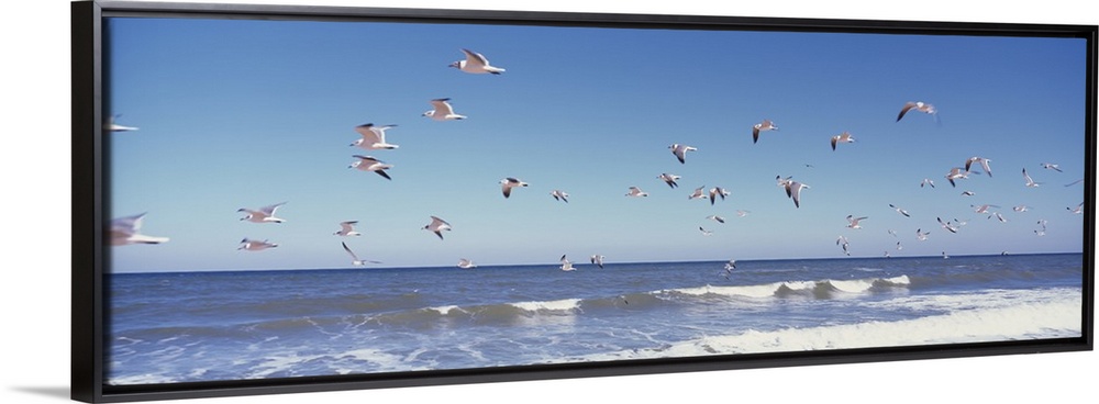 <p>Panoramic photograph of seagull flock flying over water.</p>