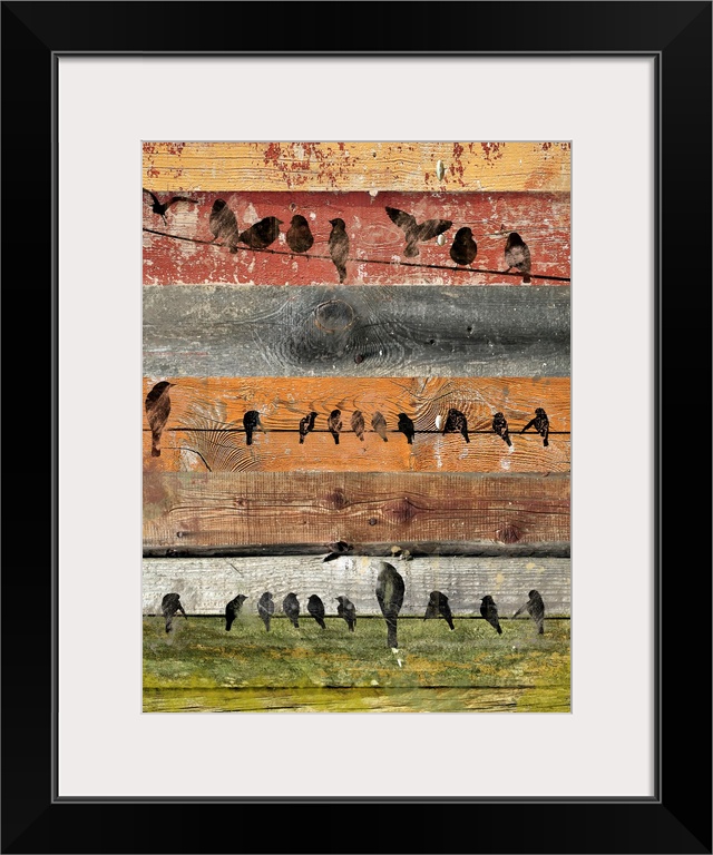 <p>Decorative art with black silhouetted birds perched on wires running across colorful, distressed, faux wooden planks.</p>