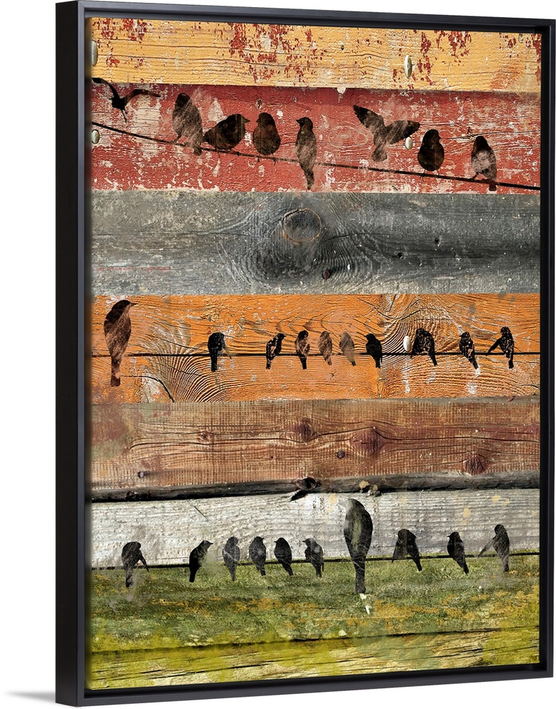 <p>Decorative art with black silhouetted birds perched on wires running across colorful, distressed, faux wooden planks.</p>