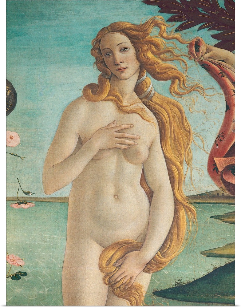 <p>The Birth of Venus, by Sandro Filipepi Known as Botticelli, 1484 - 1485 about, 15th Century, tempera on canvas, cm 184,5 x 285,5 - Italy, Tuscany, Florence, Uffizi Gallery. Detail. The naked figure of Venus, three quarters on, her face tilted towards the</p>
