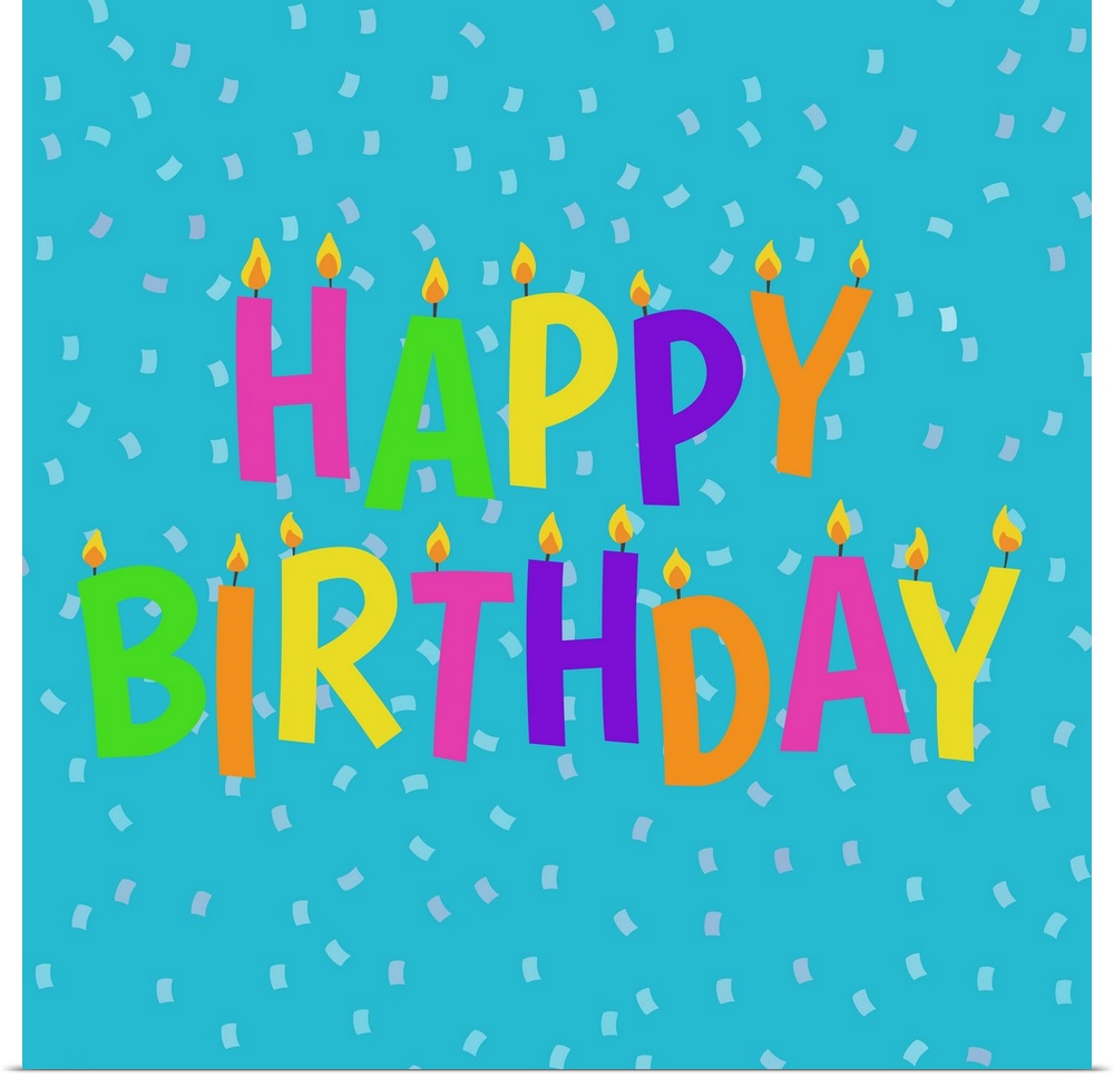 <p>"Happy Birthday" in colorful candle design on a light blue background with confetti.</p>