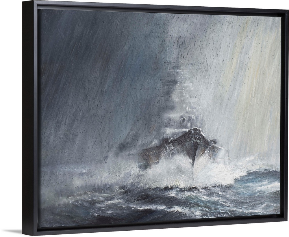 <p>Contemporary painting of a military ship on rough seas.</p>