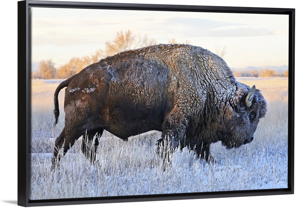 <p>Bison (Bison bison) standing in a frozen field in autumn with frost on it's hair, Grand Teton National Park, Wyoming, United States of America</p>