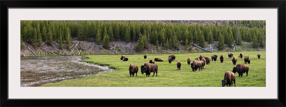 <p>Panoramic photograph of bison in a meadow at Yellowstone National Park.</p>