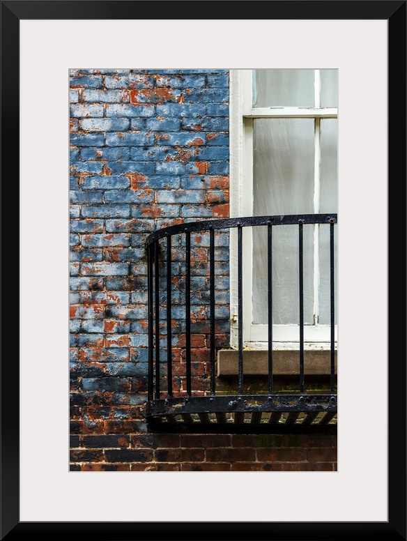 <p>A metal balcony under a window attached to a blue painted brick wall.</p>