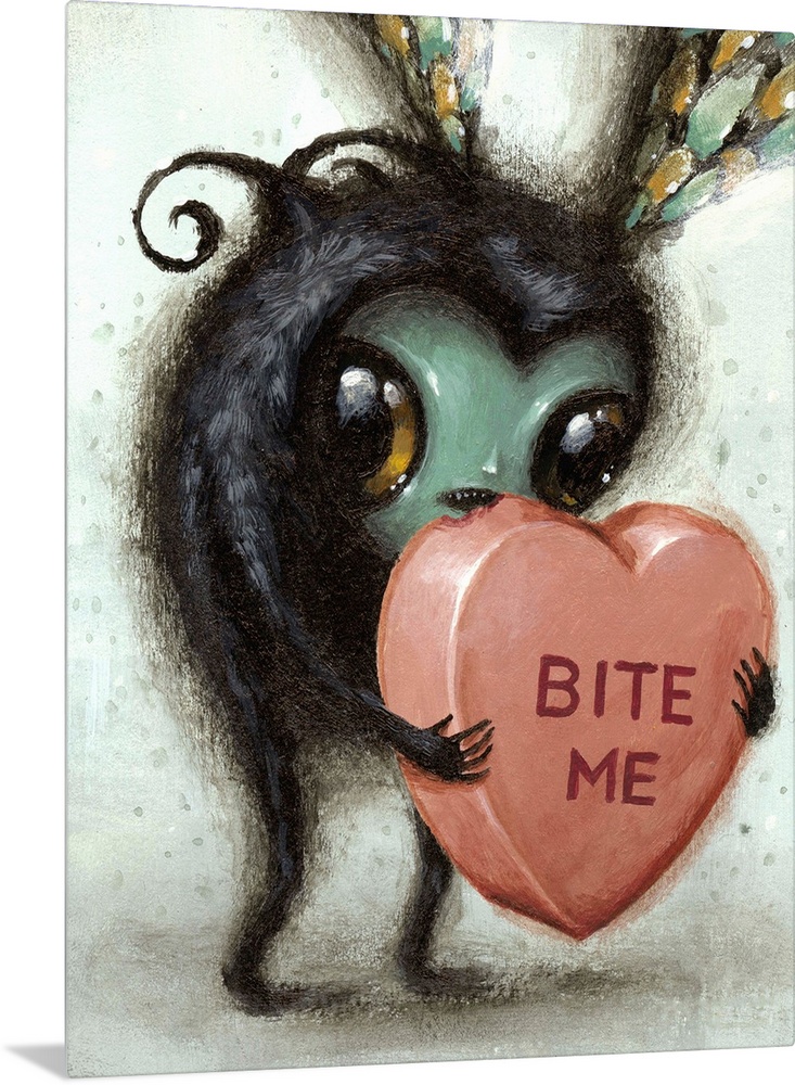 <p>Surrealist painting of an insect-like creature holding a heart-shaped candy.</p>