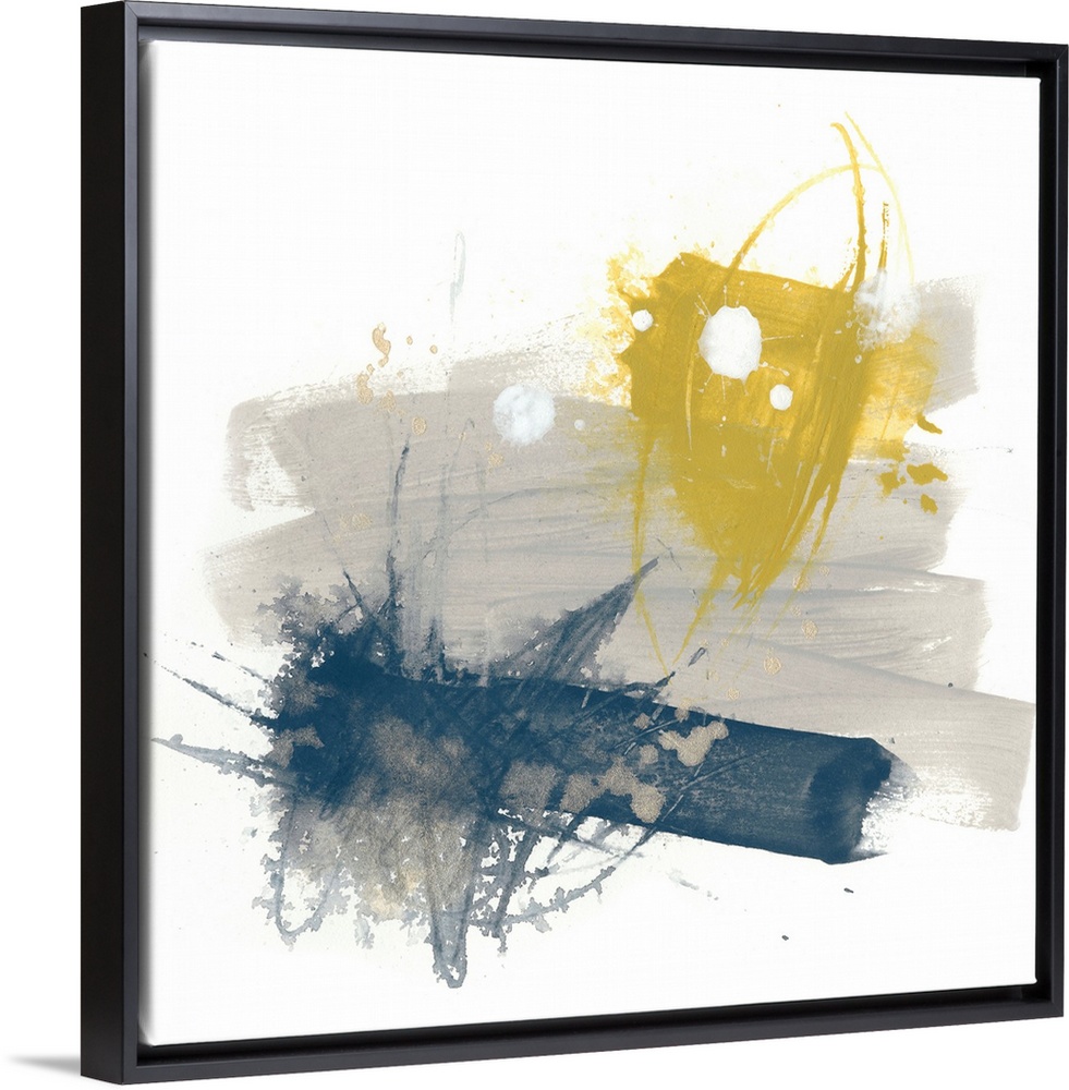 <p>Abstract art on a square canvas with yellow, grey, and navy blue paint splatters.</p>