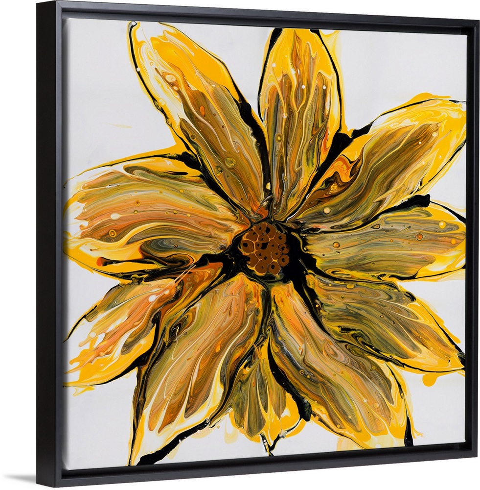 <p>Pour painting of a vibrant flower using yellow, black and orange paint to form a subtle flowing pattern inside the contrastingly large petals.</p>