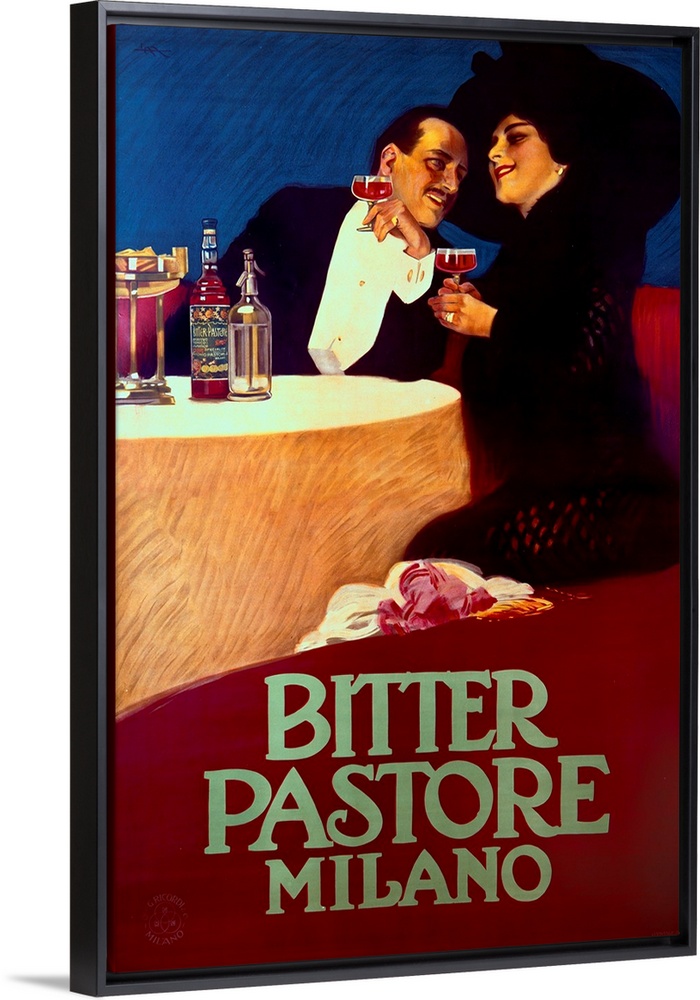 <p>This romantic vintage poster advertises Bitter Pastore, a bitter aperitif produced in Milano. It portrays an elegantly dressed couple sharing a toast in a luxurious setting, suggesting sophistication and flirtation. The man's white tuxedo contrasts sharply with the woman's dramatic black attire and wide-brimmed hat, emphasizing glamour and nightlife. Bottles of the product are prominently displayed on the table, while the deep reds and blues in the composition evoke warmth, intimacy, and indulgence-hallmarks of early 20th-century Italian beverage advertising.</p>