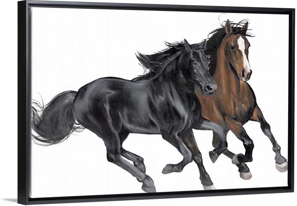 <p>Contemporary painting of a black and brown horse galloping on a solid white background.</p>