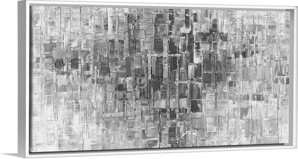 <p>Large abstract painting in gray and white hues with layered brushstrokes.</p>