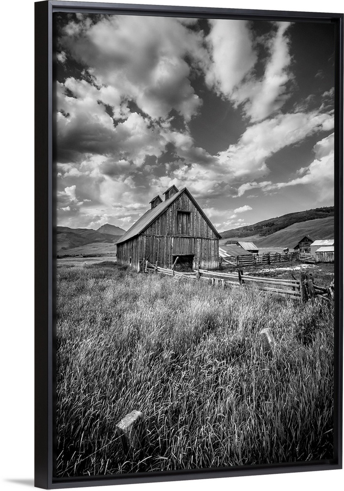 <p>Black and white photograph of farmland with a barn in the center and contrasting clouds in the sky.</p>