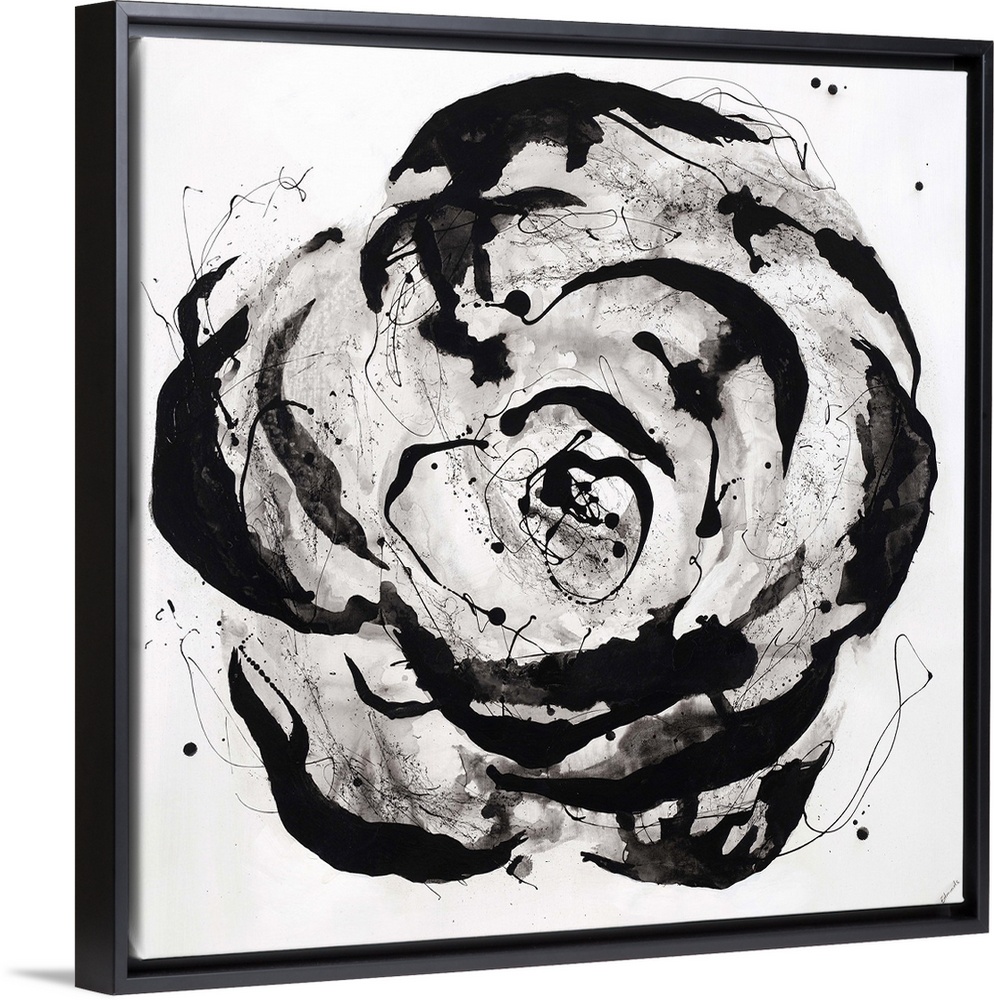 <p>Contemporary painting of a single large flower in greyscale, painted in a circular motion with varying brush thicknesses and thinly dripped paint, on a light neutral background.</p>