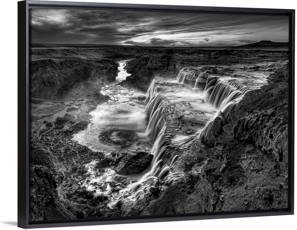 <p>Striking black and white photograph of waterfalls in the desert.</p>