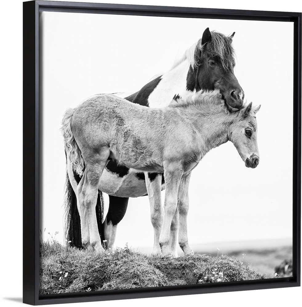 <p>Black and white photo of a horse nuzzling her foal.</p>