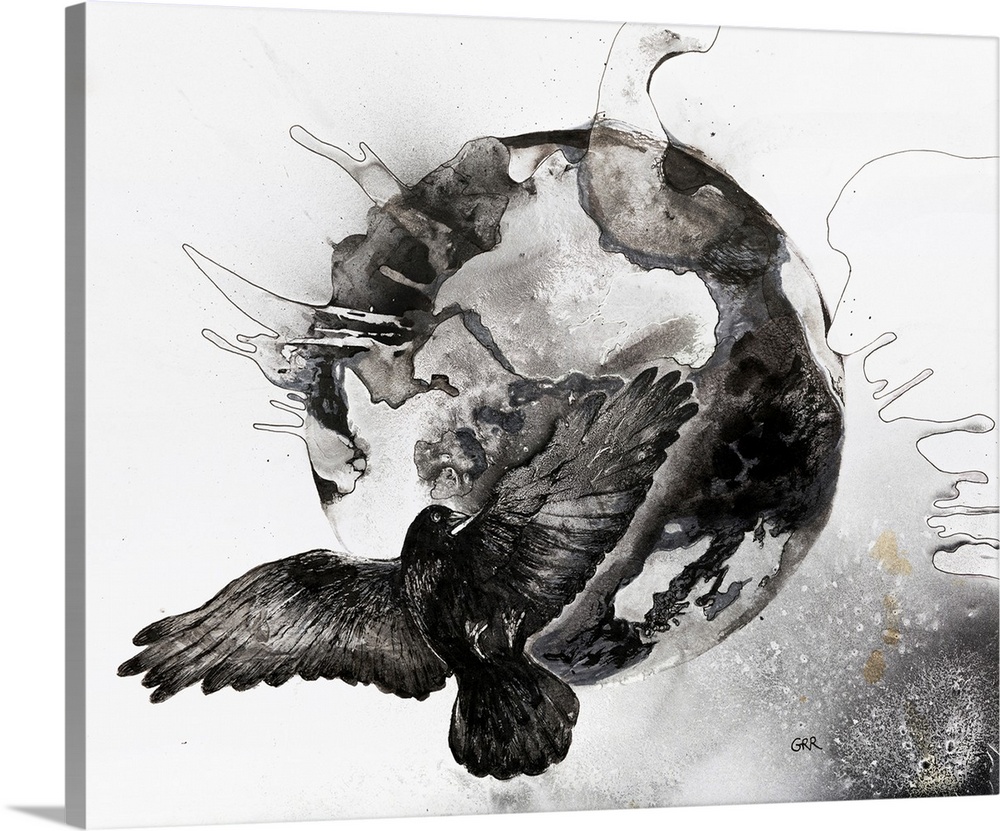 <p>Black and white illustration of a flying bird in front of a globe.</p>