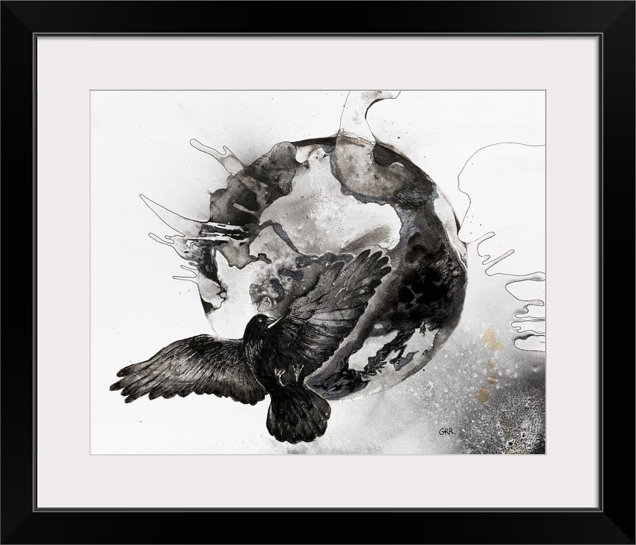 <p>Black and white illustration of a flying bird in front of a globe.</p>