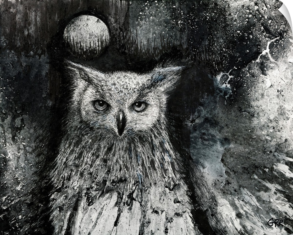 <p>Black And White Illustration Of An Owl And Full Moon In The Night Sky.</p>