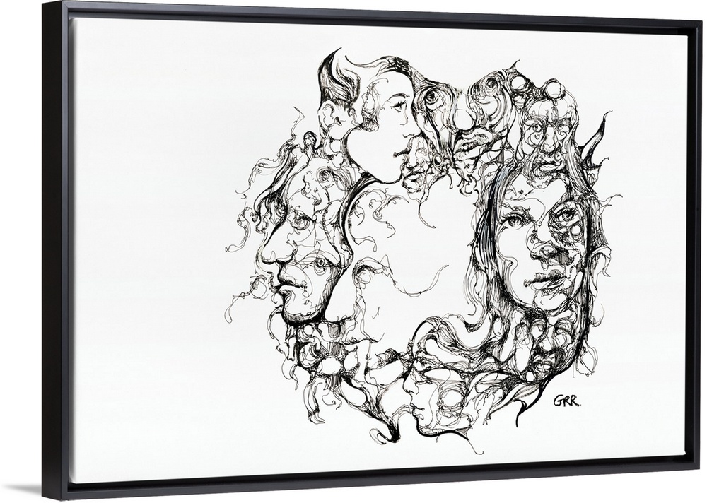 <p>Black and white illustration of numerous human faces in a circular shape.</p>