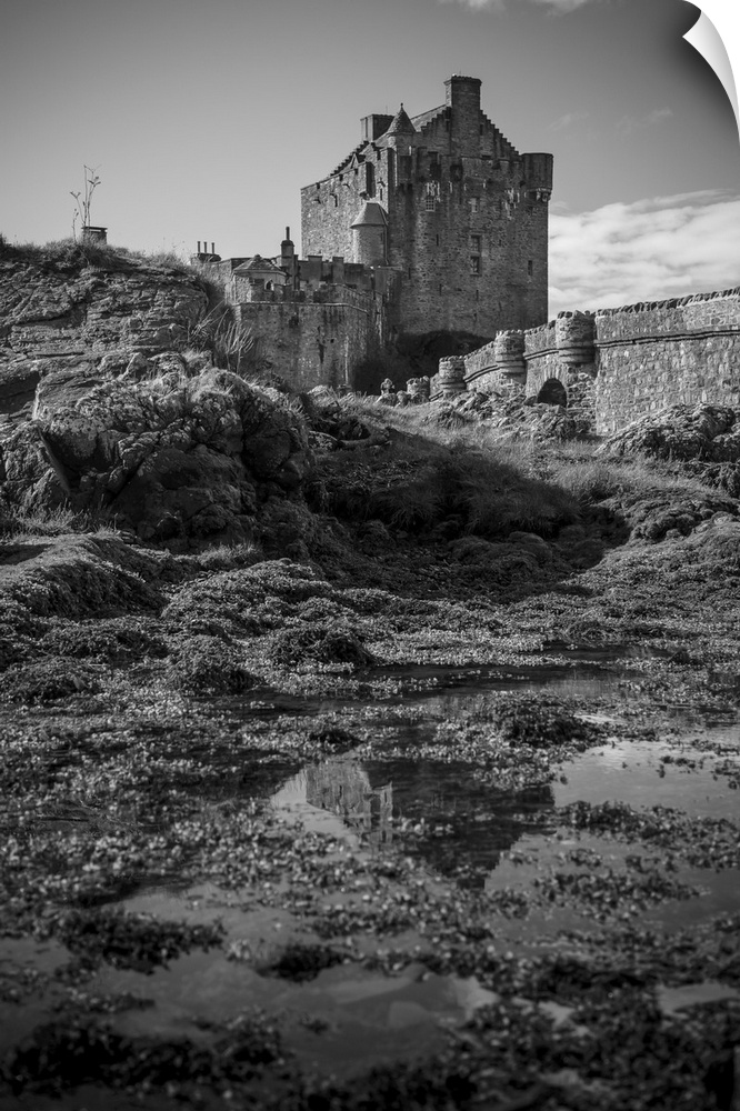 <p>Black and white image of a castle, isle of Skye, Scotland.</p>