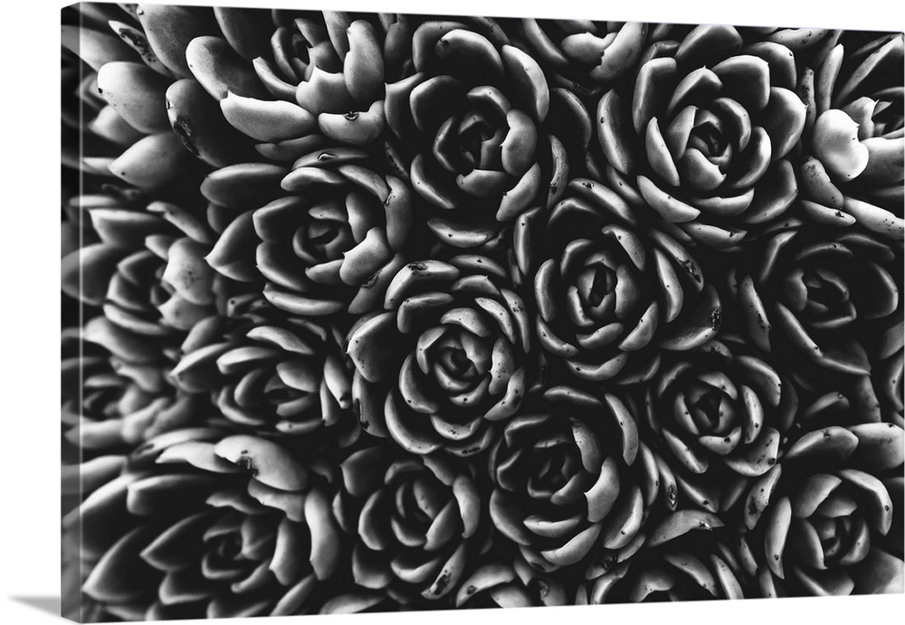 <p>Black and white image of a cluster of cactus plants in a garden viewed from directly above; Vancouver, British Columbia, Canada</p>