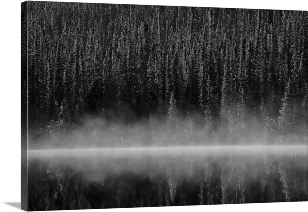 <p>Moody image in black and white image of fog on a small lake outside of Whitehorse, Yukon. Yukon, Canada.</p>