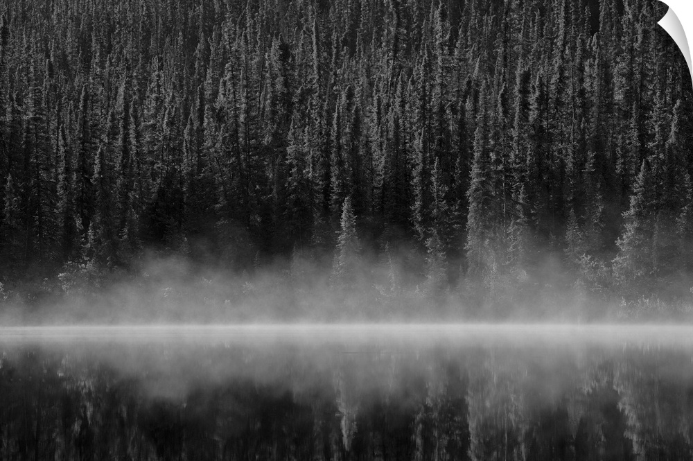 <p>Moody image in black and white image of fog on a small lake outside of Whitehorse, Yukon. Yukon, Canada.</p>