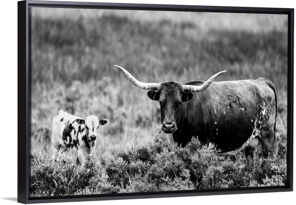 <p>Photograph of a longhorn cow and calf grazing in field of tall grasses.</p>