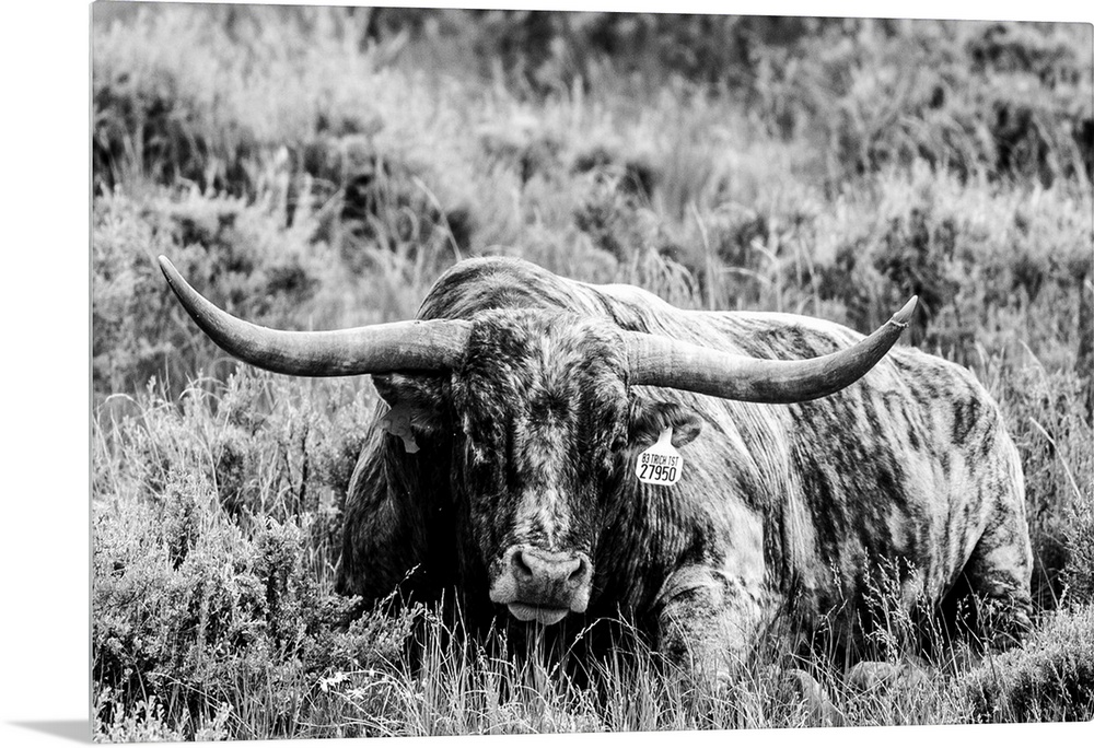 <p>Photograph of a longhorn cow laying down in field of tall grasses.</p>
