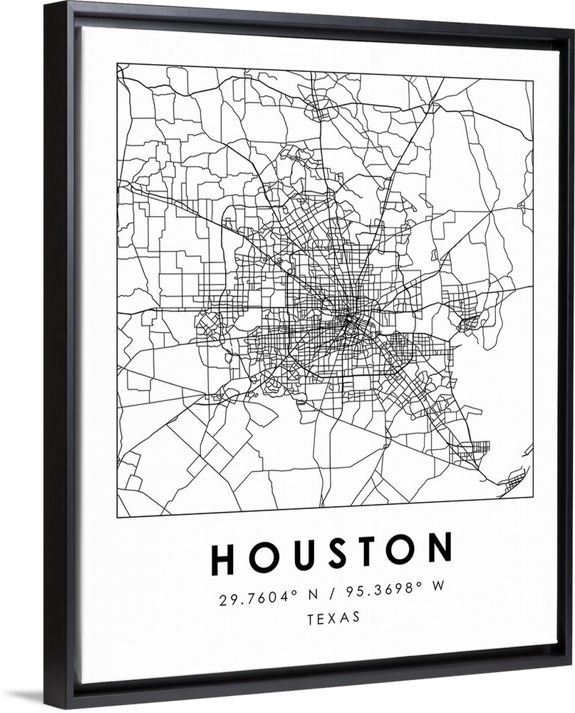 <p>Black and white minimal city map of Houston, Texas, USA with longitude and latitude coordinates.</p>
