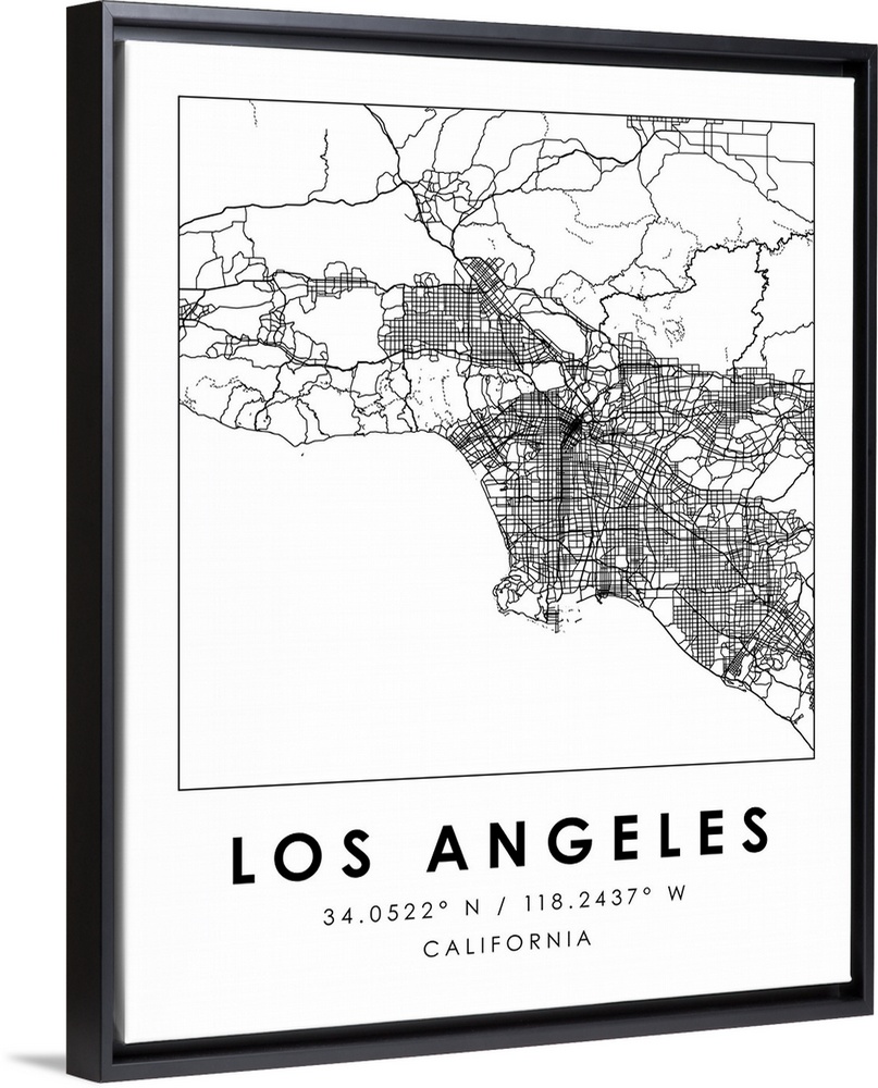 <p>Black and white minimal city map of Los Angeles, California, USA with longitude and latitude coordinates.</p>