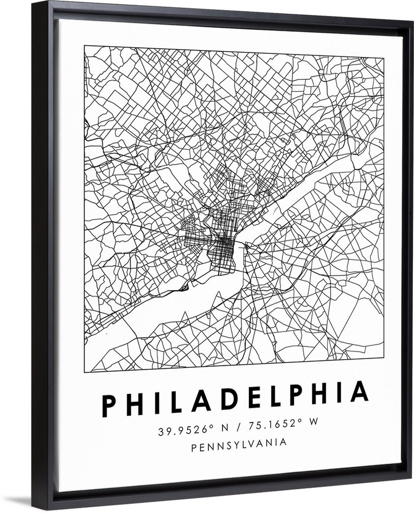 <p>Black and white minimal city map of Philadelphia, Pennsylvania, USA with longitude and latitude coordinates.</p>