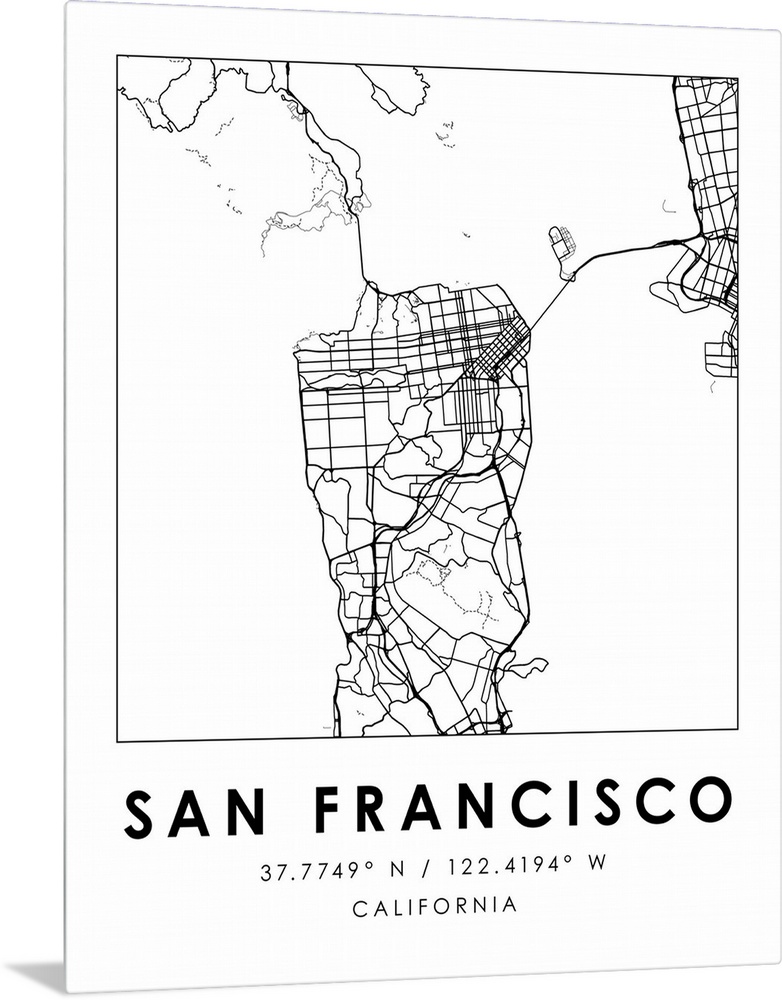 <p>Black and white minimal city map of San Francisco, USA with longitude and latitude coordinates.</p>