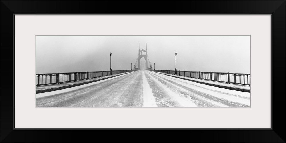 <p>Black and white panorama of St.Johns Bridge in Portland, Oregon in winter snow storm.</p>