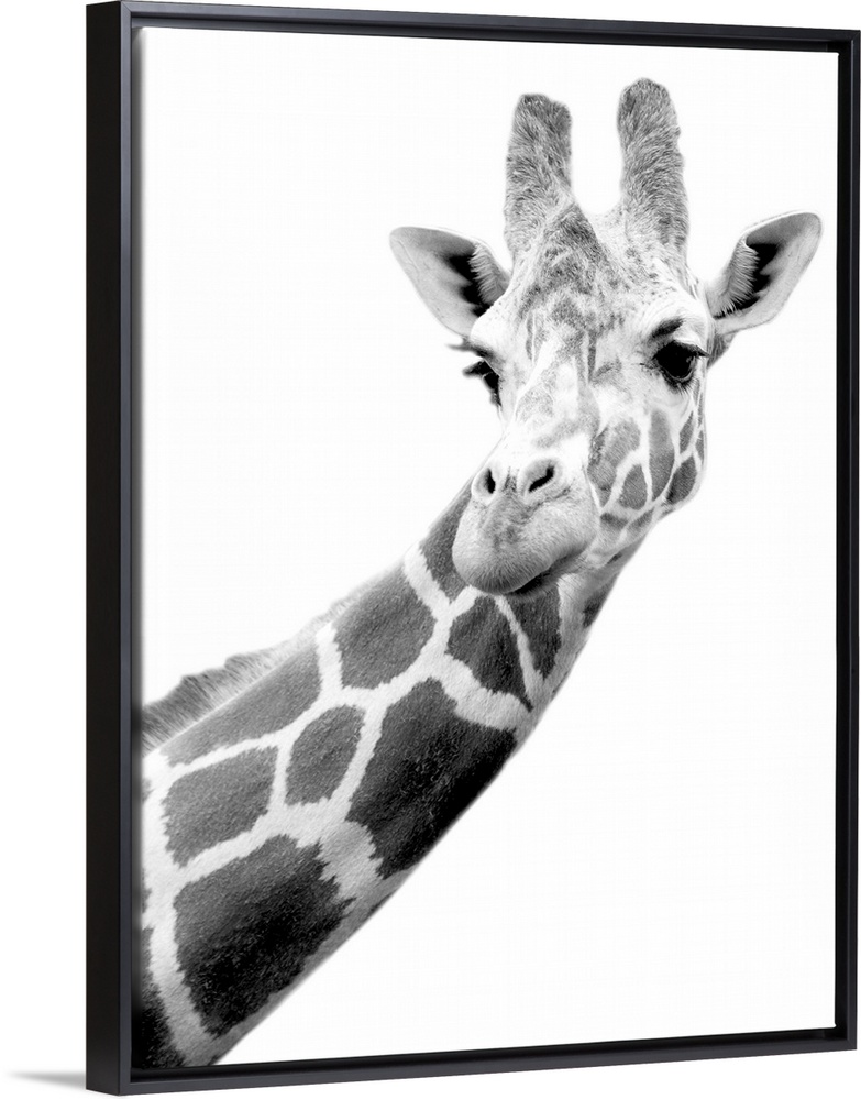 <p>The head and part of the neck of a giraffe is photographed in black and white.</p>