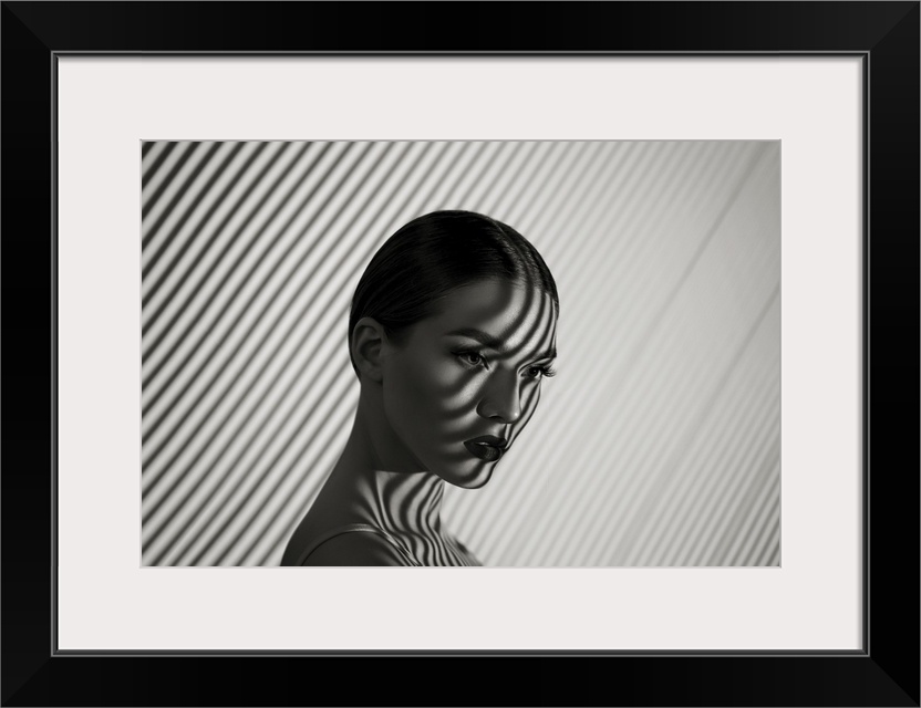 <p>Black And White Portrait Of A Girl With A Striped Shadow Pattern On The Face And Body</p>
