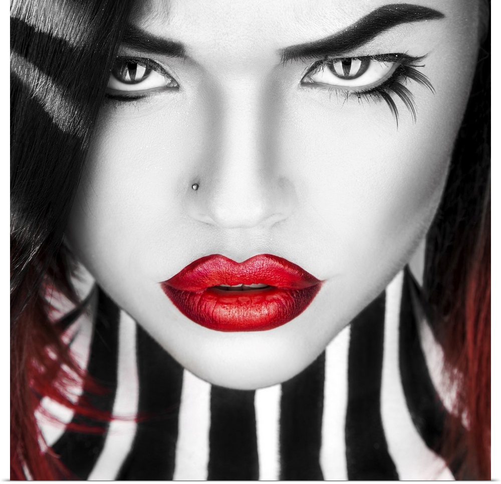 <p>Black and white portrait of beauty woman with red lips in studio.</p>