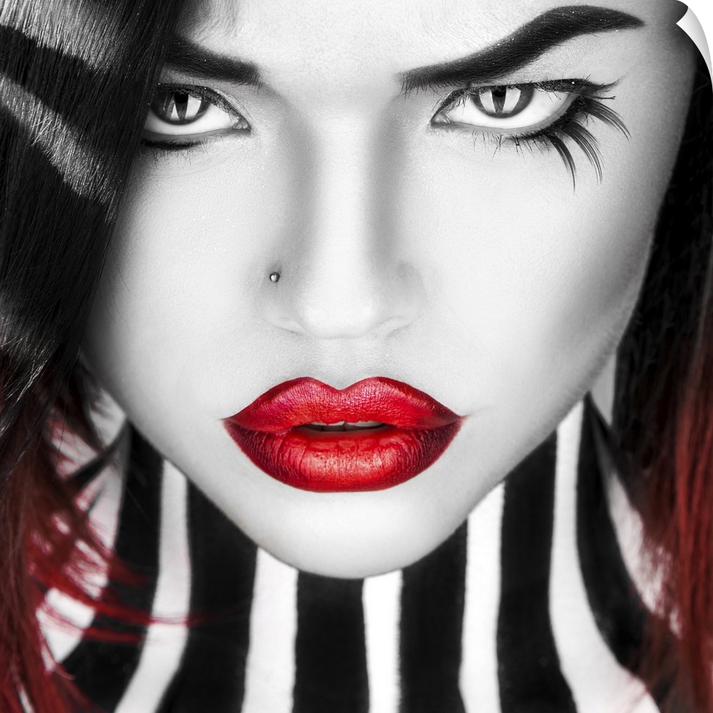 <p>Black and white portrait of beauty woman with red lips in studio.</p>