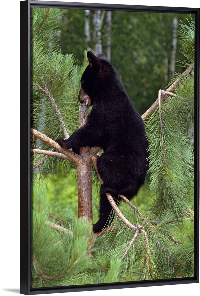 <p>Vertical image print of a baby bear climbing a tree with a forest in the background.</p>