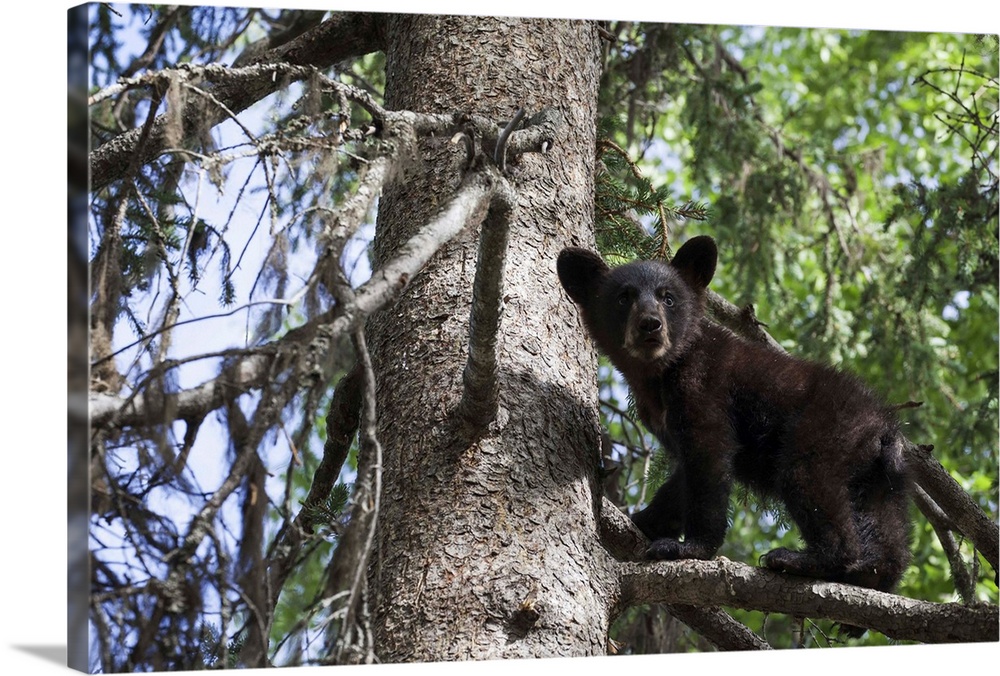 <p>Black Bear (Ursus Americanus) Cub Climbing On A Tree Branch, South-Central Alaska; Alaska, United States Of America</p>