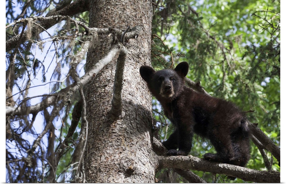 <p>Black Bear (Ursus Americanus) Cub Climbing On A Tree Branch, South-Central Alaska; Alaska, United States Of America</p>
