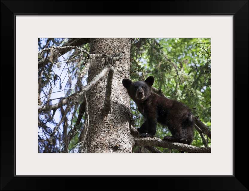<p>Black Bear (Ursus Americanus) Cub Climbing On A Tree Branch, South-Central Alaska; Alaska, United States Of America</p>