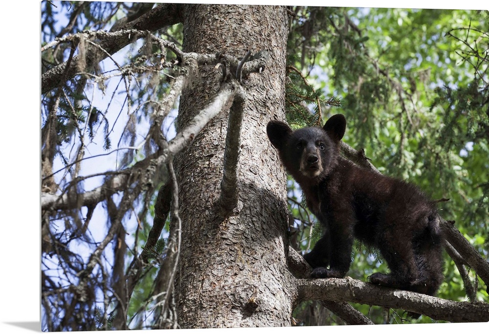 <p>Black Bear (Ursus Americanus) Cub Climbing On A Tree Branch, South-Central Alaska; Alaska, United States Of America</p>