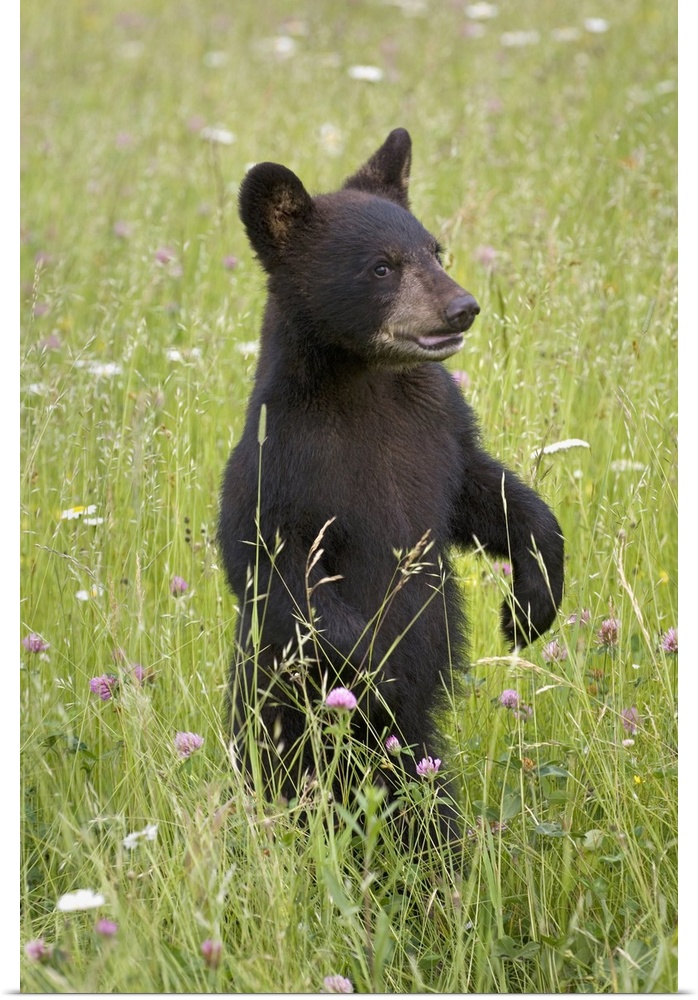 <p>Black Bear Cub In Meadow Of Wildflowers Minnesota Spring Captive</p>