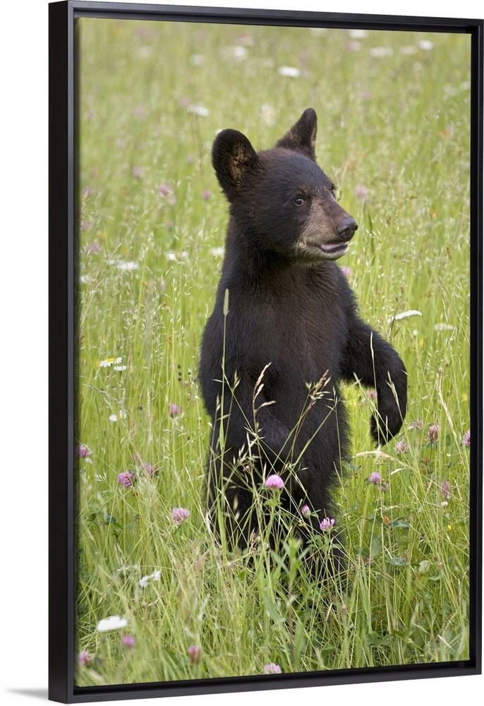 <p>Black Bear Cub In Meadow Of Wildflowers Minnesota Spring Captive</p>