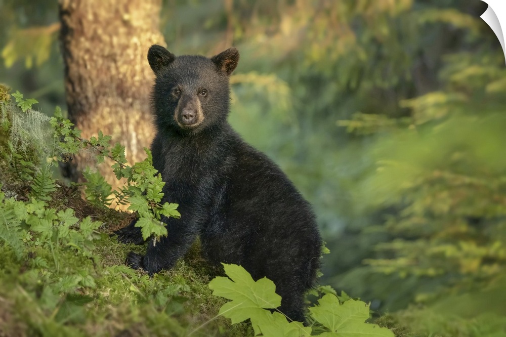 <p>Black bear cub waiting for its mother while she is fishing for salmon along the shoreline, Tongass National Forest, Alaska</p>